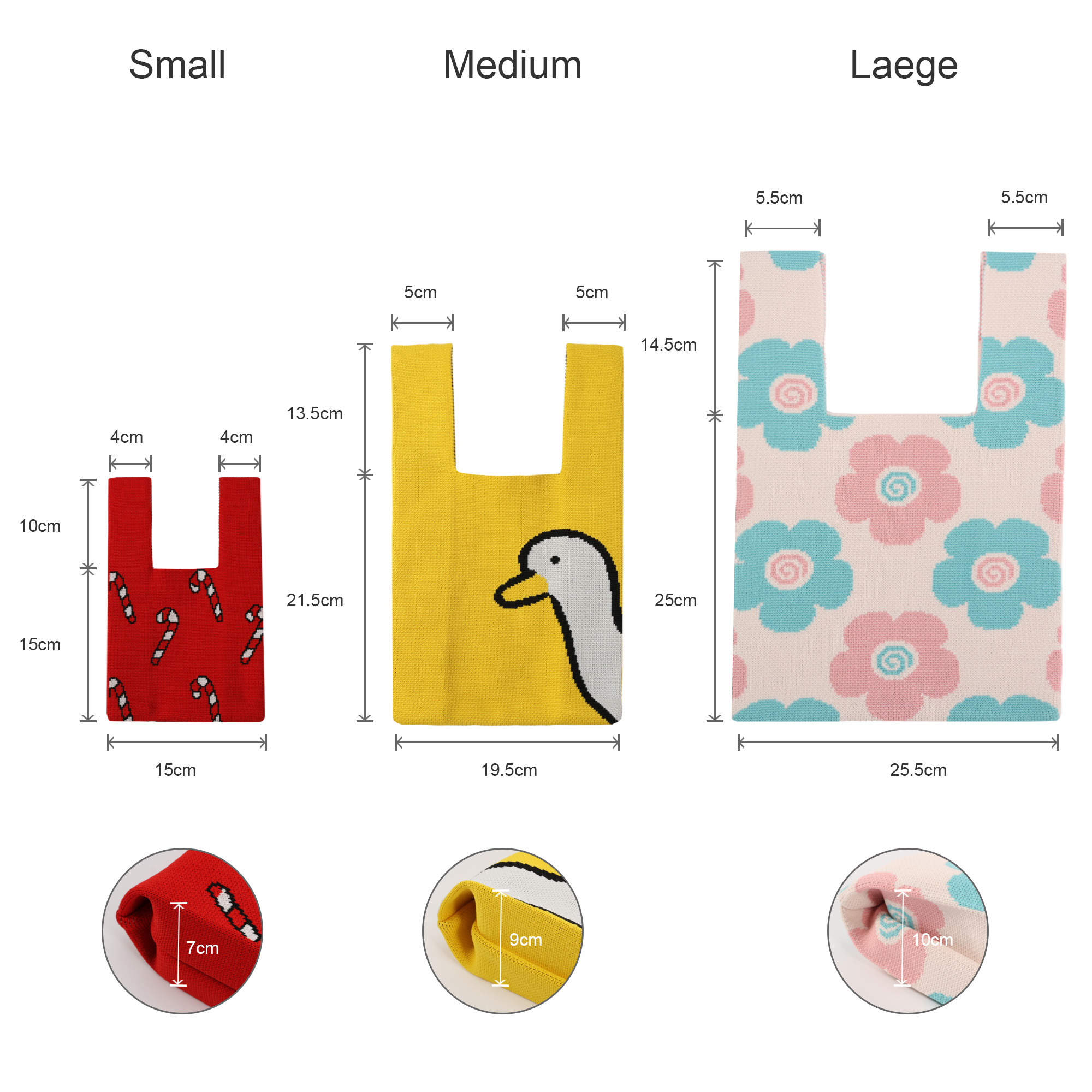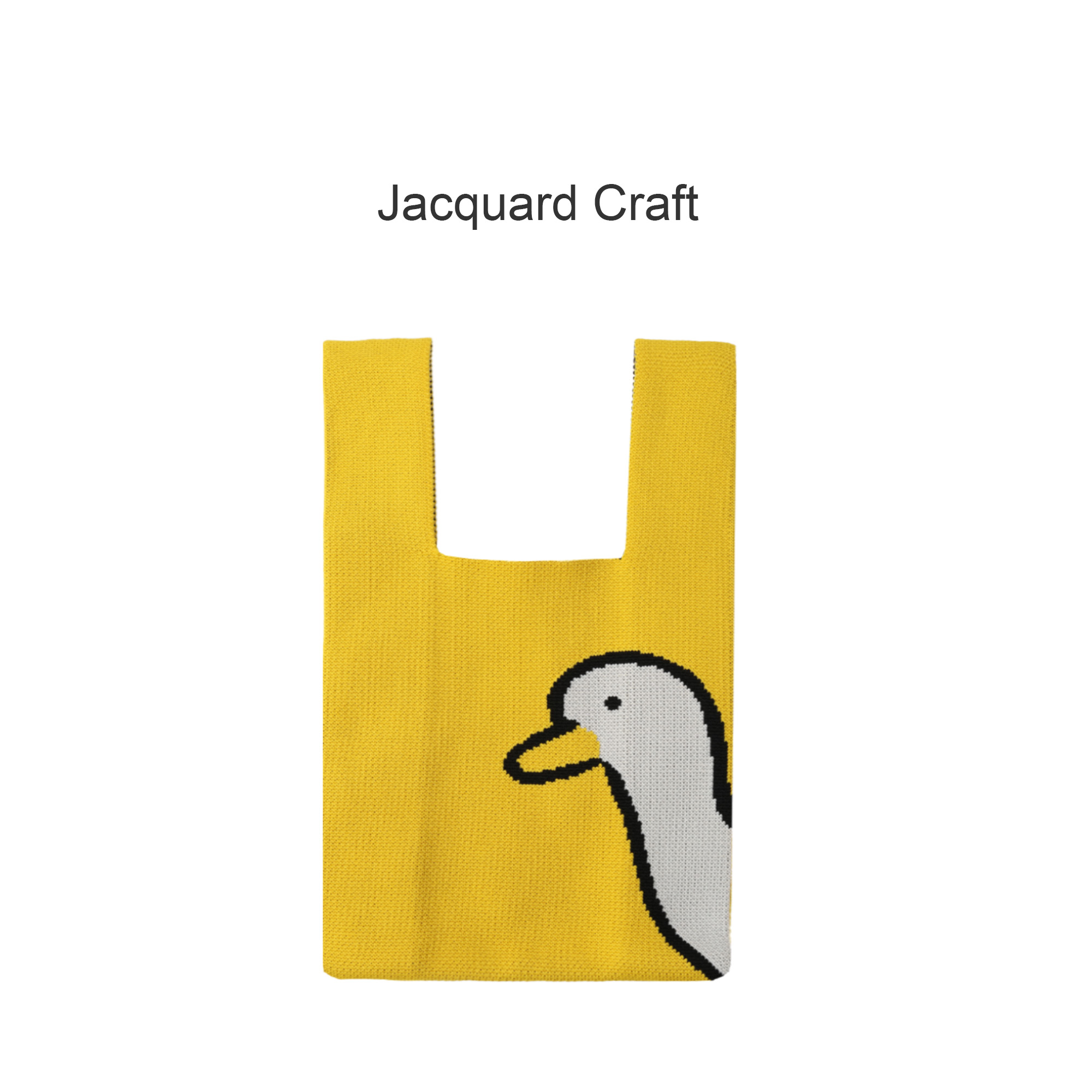 Stand out from the crowd with our Knitted Knot Handbag available in 3 sizes, it's crafted from soft polyester and uses full coverage jacquard craft to showcase the details of your design. It pairs seamlessly with multiple styles, making it an excellent choice to elevate your fashion look!. Sizing: Small: body: 15x15cm handle: 4x10cm side width: 7cm Medium: body: 19.5x21.5cm handle: 5x13.5cm side width: 9cm Large: body: 25.5x25cm handle: 5.5x14.5cm side width: 10cm. Materials: Polyester. Price Notes: Small size price includes 3 colours. Medium and large size price includes 4 colours. Up to 5 can be achieved, but this may increase the time to finalise the pre production sample, and cost. Please talk to us before placing your order. The more colours added to the design, the thicker the bag will become. Print Position: Full size.8week