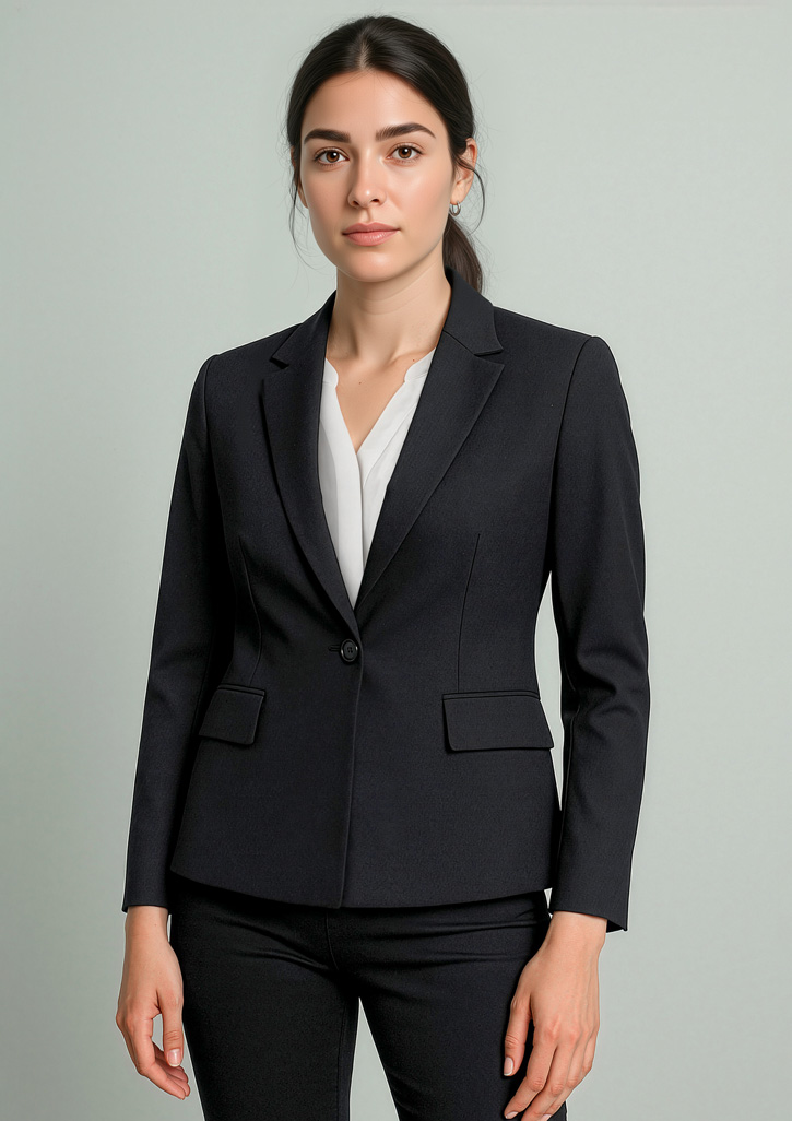 Fabric: Renew Suiting: 77% Recycled Polyester, 20% Viscose, 3% Elastane A lightweight fabric that's engineered to be an easy-care, machine wash-and-wear fabric with minimal creasing. Made for ease and versatility for when you are on the go. A conscious product choice, with 77% made from post-consumer recycled polyester. Features: Single button opening. 2 Front jet pockets with flaps. Front waist darts for a more tailored look. Fully lined with internal pockets. Contrast lining inside sleeve. Internal zip for embroidery. Cuff buttons are not functional. Sizes: 4 - 30. Colours: Navy Dusk, Pencil Black,. Cares: Extras: