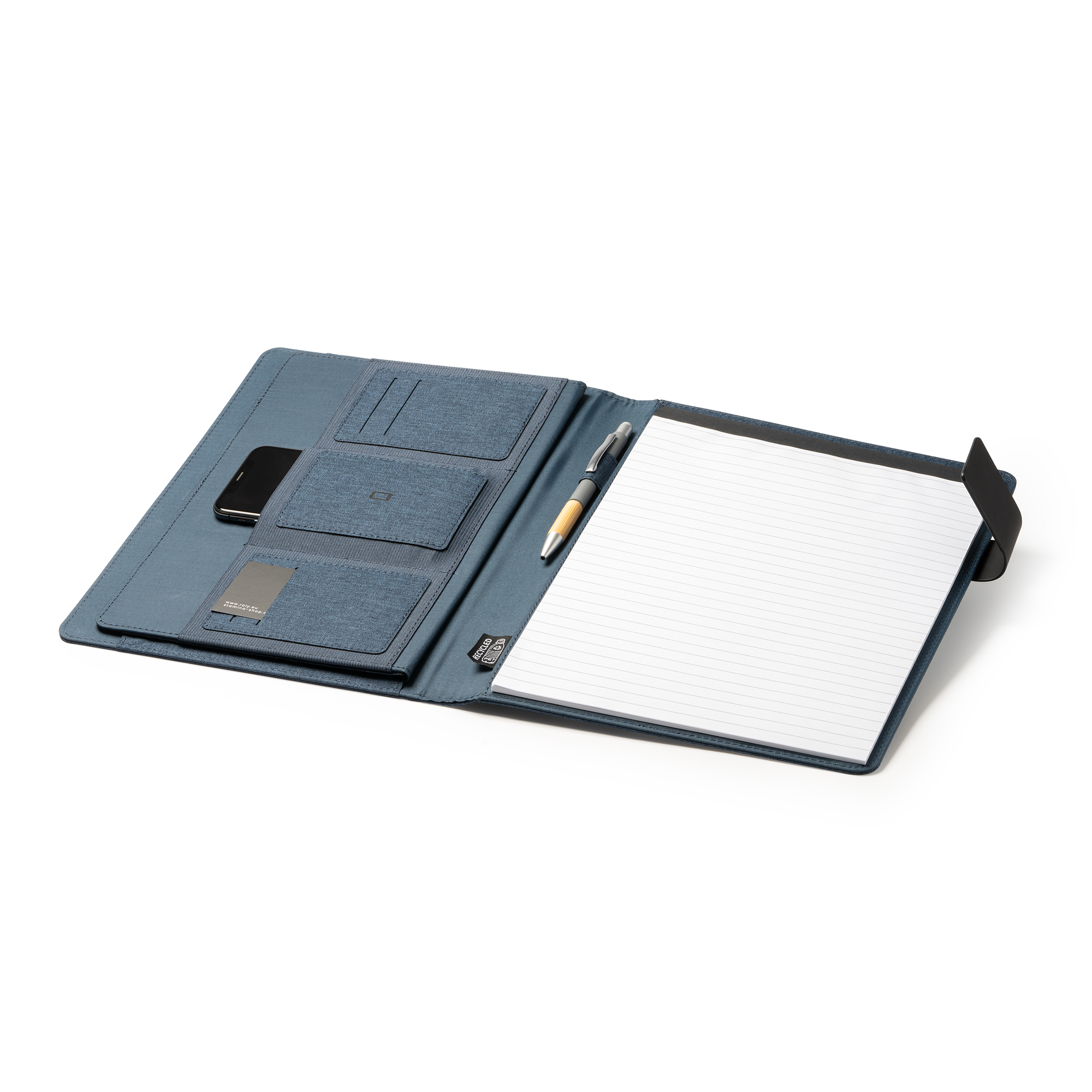Our multipurpose A4 folder is crafted from heather 600D RPET, showcasing a commitment to sustainability through the use of recycled materials. Featuring a sleek magnetic clasp for secure closure, this folder is both stylish and functional. It comes with a detachable 30-sheet lined pad, perfect for note-taking or organizing your thoughts. The interior is thoughtfully designed with 4 pockets for documents, business cards, or small items, along with a pen holder for easy access to your writing instrument. Ideal for professionals, students, or anyone looking to keep their essentials organized in an eco-friendly way.
